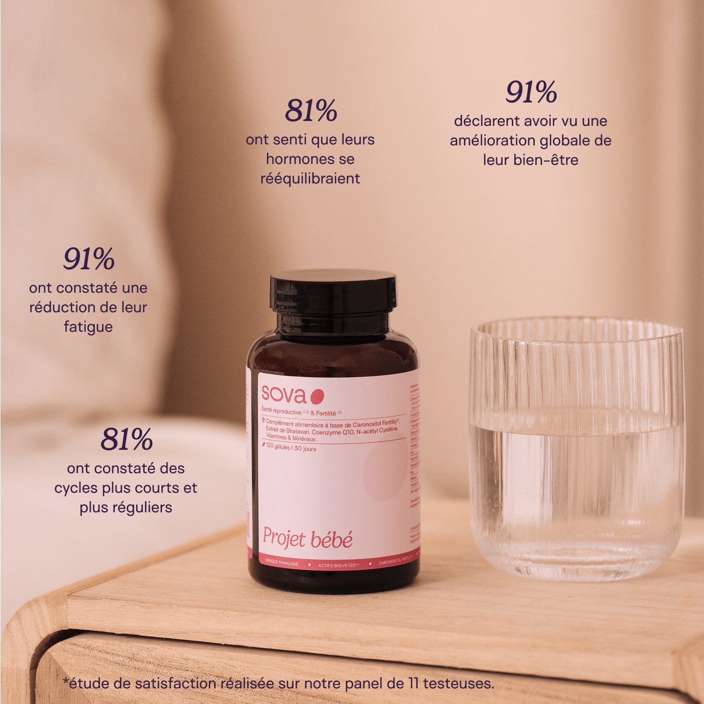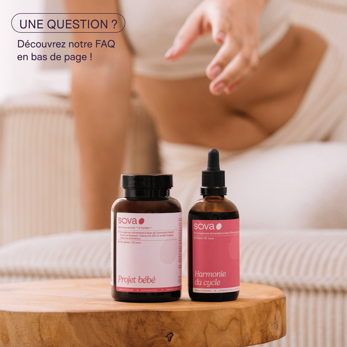 Nous recommandons une prise de 3 à 6 mois. Ce délai permet au corps de retrouver progressivement un équilibre hormonal et une ovulation régulière. Tu peux poursuivre la cure jusqu’à la confirmation de grossesse.