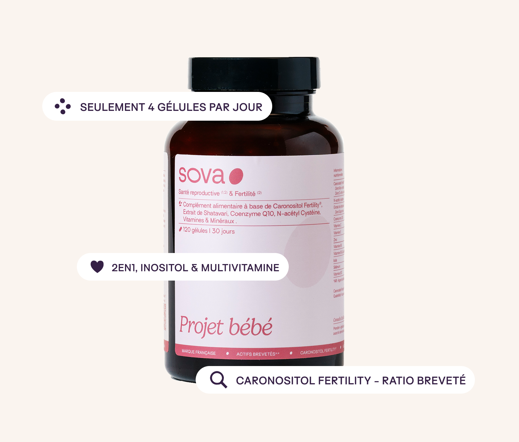 Né du constat que la plupart des produits à base d’inositol manquent de vitamines prénatales essentielles, il combine le complexe breveté Caronositol Fertility® avec des vitamines et minéraux clés pour soutenir l’ovulation, réguler les cycles et préparer le corps à la grossesse naturellement 🌿.
