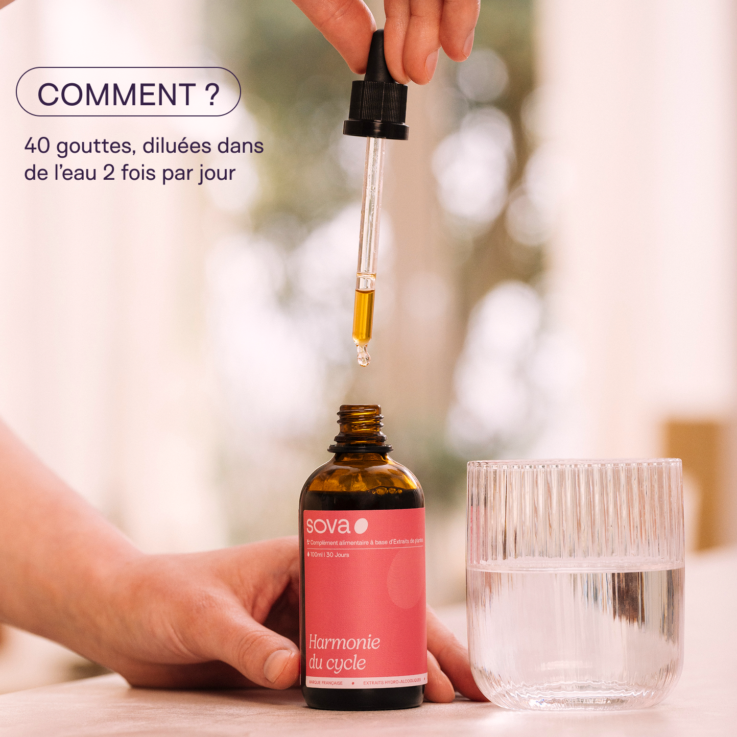Il te suffit de compter 80 gouttes par jour, à répartir en 2 prises. Tu peux les prendre pures sous la langue (si tu es à l’aise avec le goût naturel des plantes), ou bien les diluer dans un verre d’eau, une tisane tiède ou même un jus doux. L’important, c’est de l’intégrer dans ta routine de manière simple et régulière.
